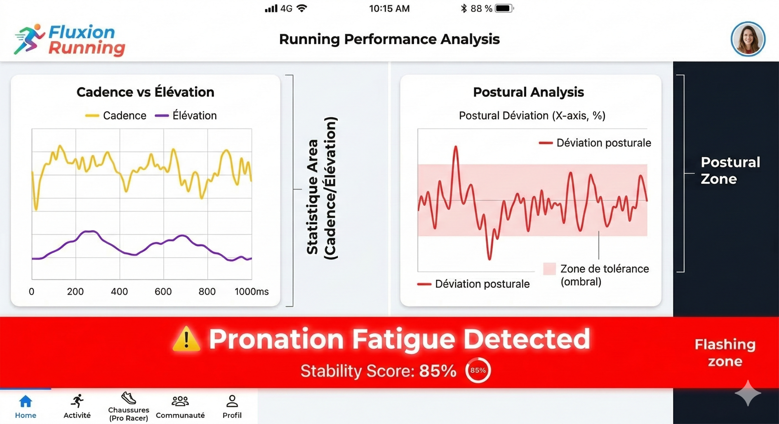 Ne laissez plus la fatigue dégrader votre technique. Notre algorithme exclusif surveille votre pression plantaire et votre stabilité en temps réel